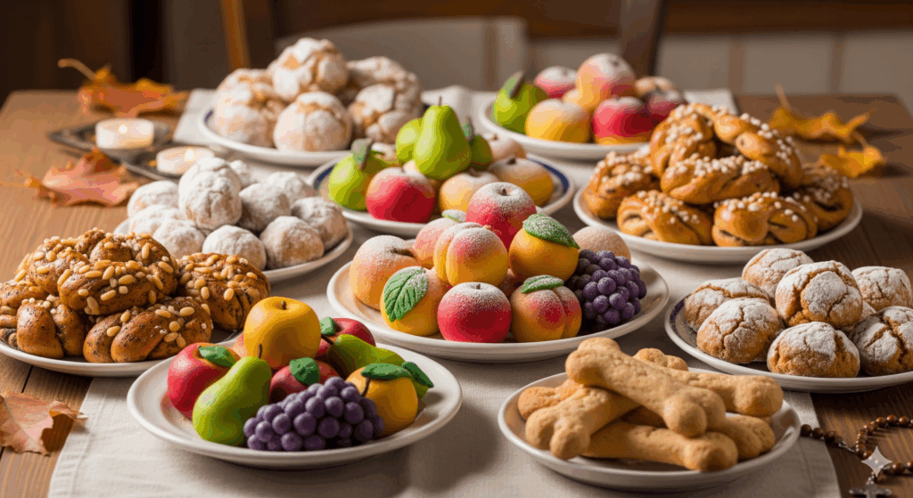 南部、特にシチリア島では、「フリッタ・デイ・モルティ(Frutta dei morti)」と呼ばれるマジパン製のフルーツや野菜の形をしたお菓子が一般的です。カラフルで見た目も可愛らしく、子どもたちが楽しみにしているお菓子でもあります。これらは、故人が生前好きだった食べ物を模して作られたりもします。また、シチリアでは「オッサ・デイ・モルティ(Ossa dei morti)」という、故人の骨を模した硬いビスケットも食べられています。