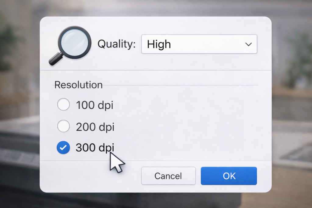 一般的なPCモニターの解像度は約96dpi(Windows)ですが、プリンターで文字をくっきり印刷するには最低でも300dpiが必要です。つまり、画面のピクセル数のまま印刷しようとすると、情報量が圧倒的に足りず、プリンターが無理やり引き伸ばして印刷するため、ぼやけが発生します。