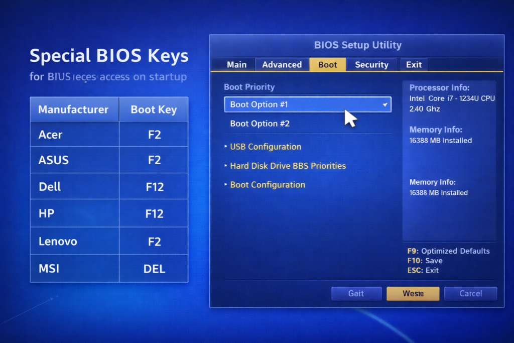 BIOSとは、パソコンの電源が入った直後にハードウェアのチェックを行い、「どの順番で記憶装置からOSを読み込むか」を決定する基本プログラムです。通常、この「ブート優先順位(Boot Priority)」は「1番目:内蔵ハードディスク(HDD)」に設定されています。そのため、いくらUSBを挿していても、HDD内のWindowsが優先して読み込まれてしまうのです。